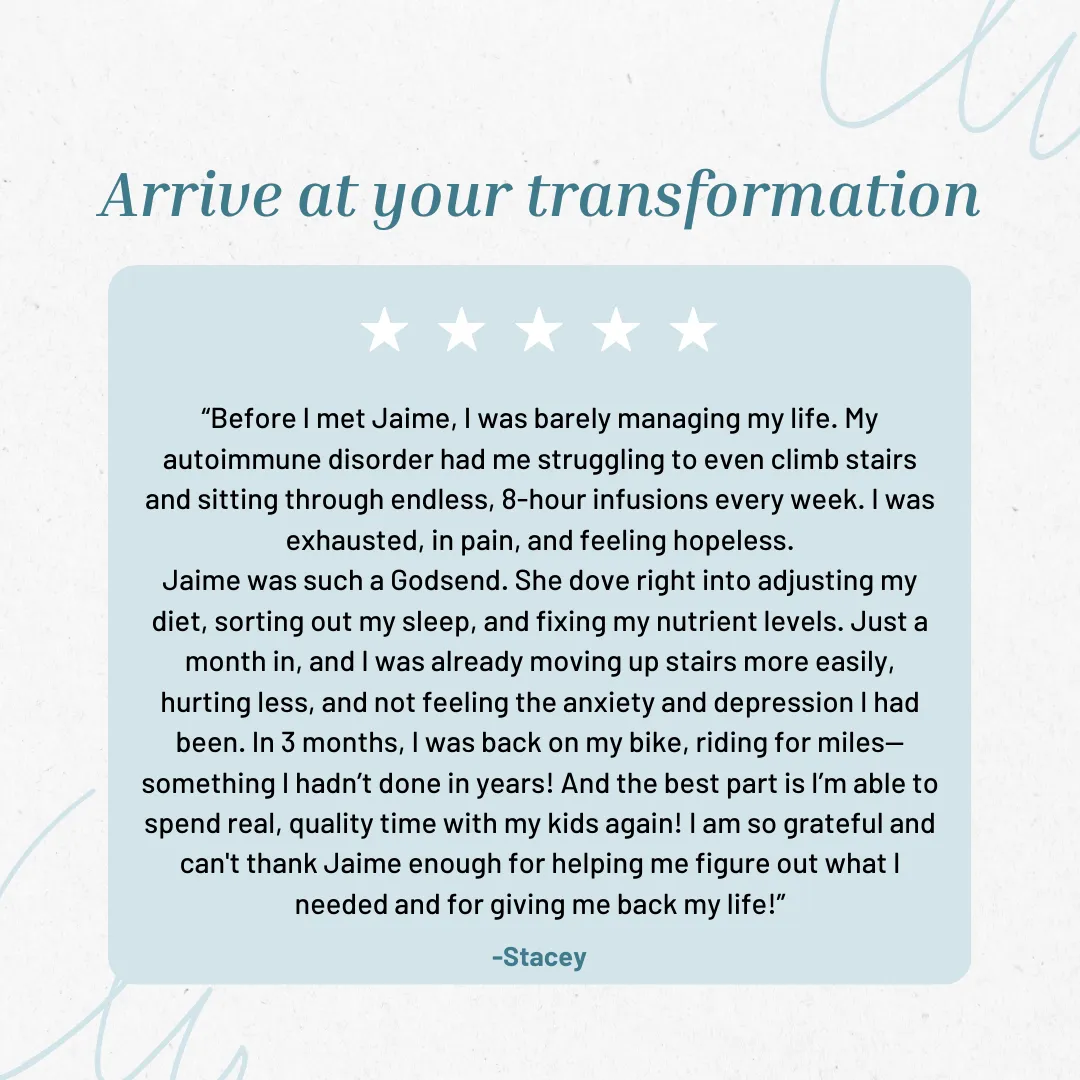 Jaime is available for podcast interviews, summits, webinars, and other speaking engagements. She believes that every person’s story matters for their health and will inspire your audience to become advocates for themselves and embrace a happier and healthier life.